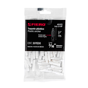 Taquete de Plástico 3/16" FIERO, Color Blanco, Bolsa con 50 Piezas, TRUPER TAQ-3/8P