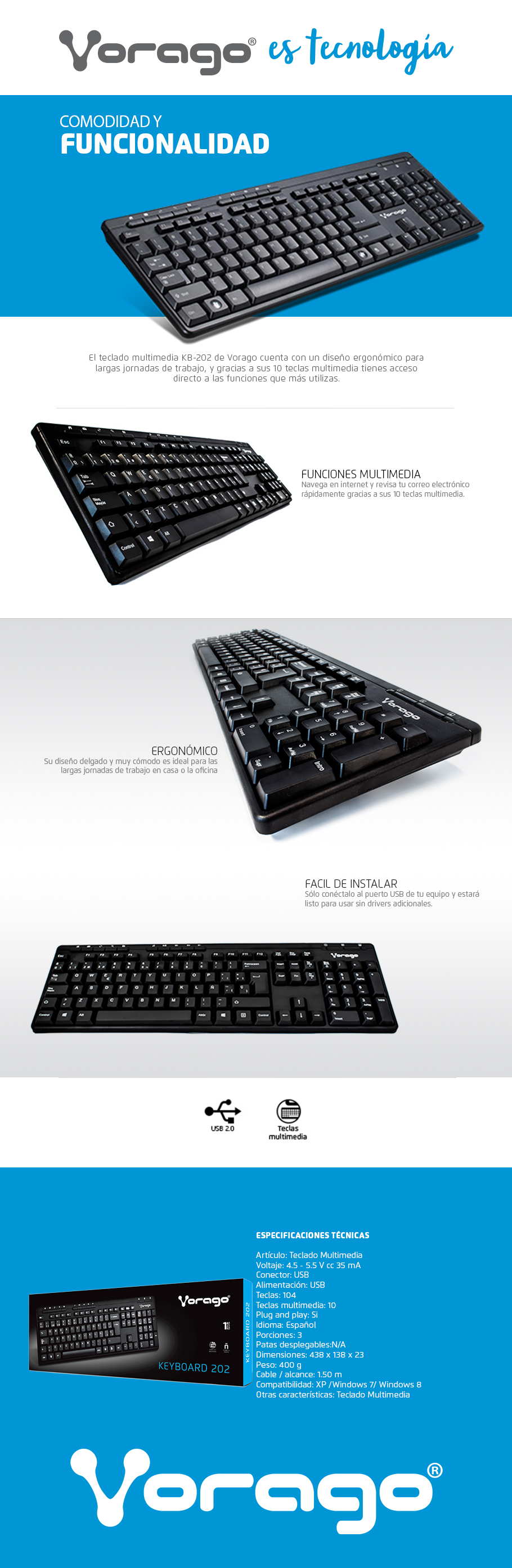 Teclado Multimedia, Alámbrico (USB), 3 Posiciones, Color Negro, VORAGO KB-202